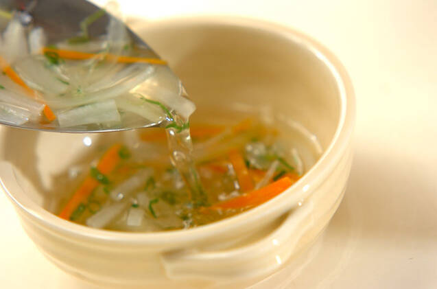 鍋に<スープ>の材料を入れ、強火にかける。煮たったら大根、ニンジン、玉ネギを加える。野菜がしんなりするまで煮て、刻みネギを加えて火を止める。器に注ぎ分け、仕上げにコショウを振る。