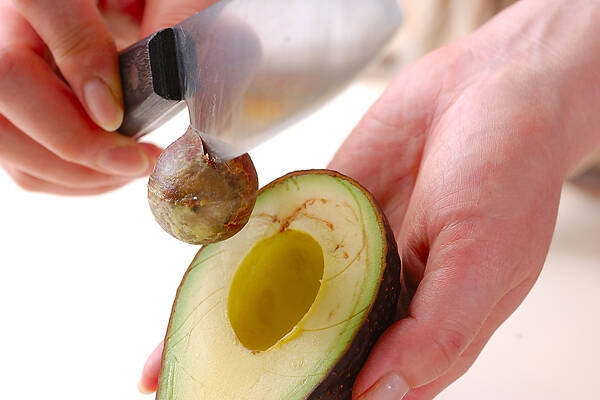 アボカドは種を取り、皮をむいて縦8等分に切って、レモン汁を振る。