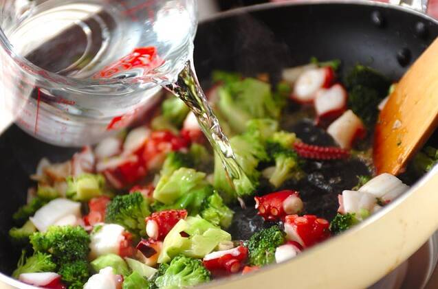 フライパンにオリーブ油、ニンニクを入れて弱火にかけ、香りがたってきたらアンチョビ、赤唐辛子を加え、ブロッコリーとゆでタコ足を加えて炒める。油がなじんだら分量外の水400mlを加え、煮立ったら弱火で煮込む。