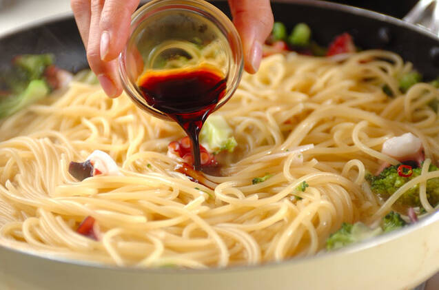 (1)のフライパンに(2)のスパゲティを加えて混ぜ合わせ、ゆで汁80mlとしょうゆを加えてさらに混ぜ合わせ、器に盛り分ける。