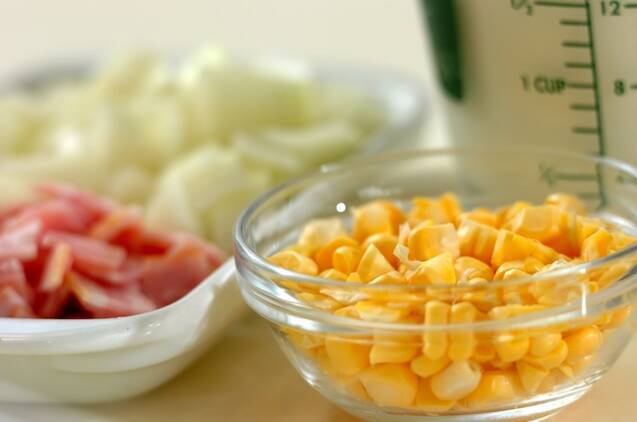 トウモロコシは粒を軸から削ぎ落とす。玉ネギ、ベーコンは角切りにする。