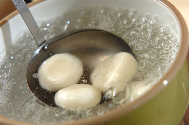 <白玉団子>を作る。白玉粉に水を少しずつ加えて、耳たぶ位のかたさになるまで練り合わせる。白玉を食べやすい大きさに丸め、少し中央をくぼませながら熱湯に入れ、浮いてくればそのまま1分位ゆで、冷水に取る。
