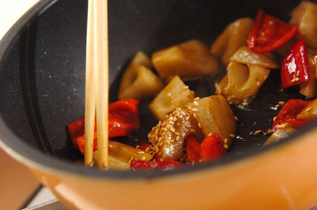 <調味料>の材料を加え、汁気がほとんどなくなるまで炒め、白ゴマを全体にからめて器に盛る。