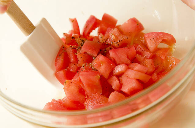 大きめのボウルにトマト、ニンニク、EVオリーブ油、塩黒コショウを入れて混ぜ合わせ、ラップをかけて冷蔵庫で冷やしておく。