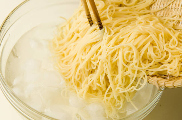 たっぷりの熱湯に塩を加えてスパゲティーを入れ、時々菜ばし等で混ぜながら、表示の時間より1分長めにゆでる。ゆで上がればザルに上げて流水で粗熱を取り、氷水に放ち、冷たくなればザルに上げてしっかり水気を切る。