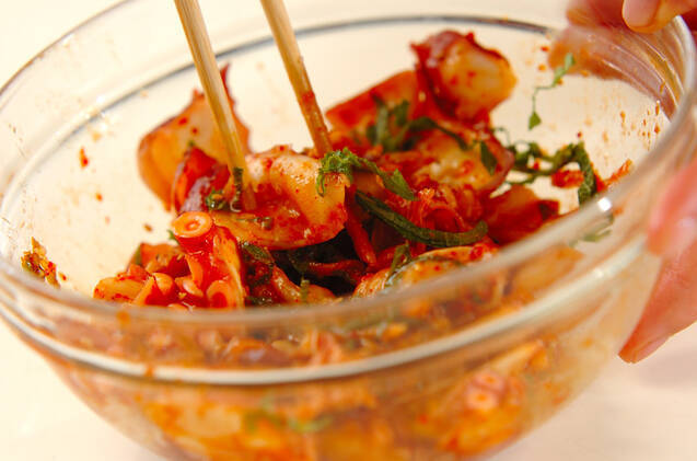 <調味料>のボウルに白菜キムチ、ゆでタコ足を入れて混ぜ合わせる。全体に混ざったら、大葉を加えてサッと和え、器に盛る。