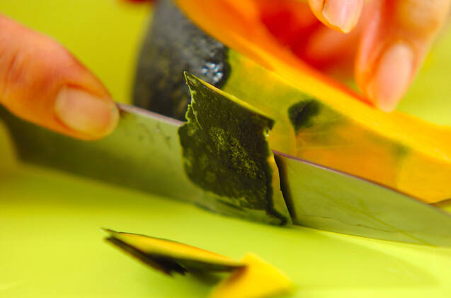 カボチャは種とワタを取って皮を取り除き、水でサッとぬらしてラップに包み、電子レンジで柔らかくなるまで2分位加熱する。