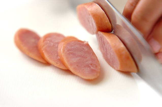 ソーセージは熱湯でゆで、幅7~8mmの斜め輪切りにする。