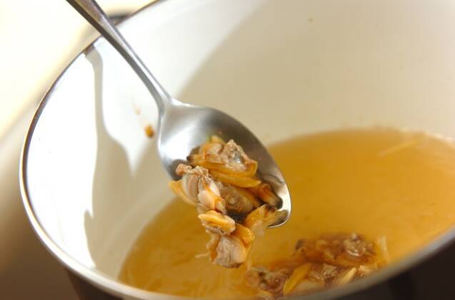 (1)の鍋にショウガを加えて中火で熱し、薄口しょうゆ、みりんで味を調え、アサリのむき身を加える。