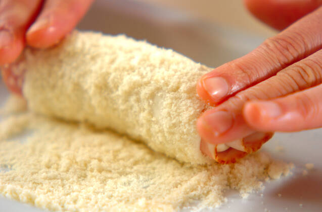 生地を裏返し、麺棒で12cm位の楕円形にのばす。粒マスタードをぬり、ベーコンを2枚ずつのせ、上から麺棒を転がしてなじませる。手前から巻き、巻き終わりを指でつまむようにして閉じる。粉チーズを生地の表面にまぶし、閉じ目を下にしてオーブンシートを敷いた天板に間隔をあけてのせる。