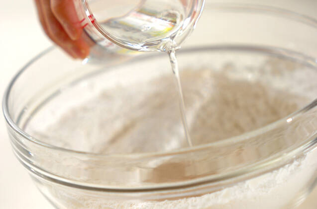 粉の真ん中にくぼみを作り、その中にイーストを入れる。ぬるま湯を少量加え、指でイーストをすりあわせるようにして溶かし、残りのぬるま湯を加える。