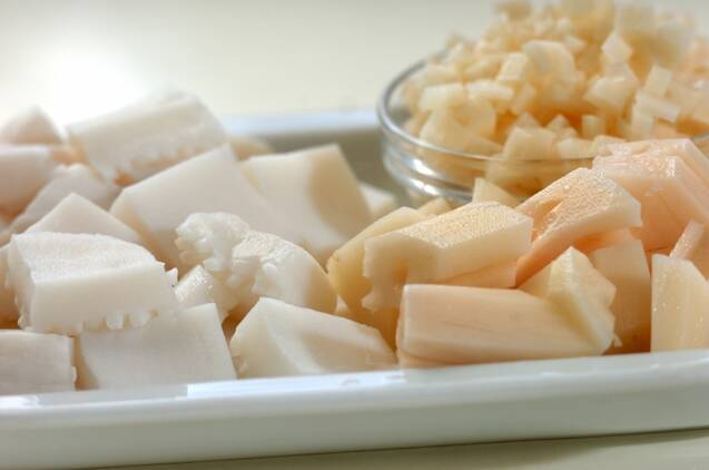 ロールイカは解凍し、ひとくち大に切る。レンコンは皮をむいて分量外の酢水に5~6分つけ、水気をきって半分はザク切りにし、残りは5mm角に切る。