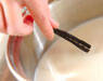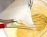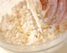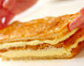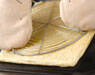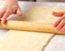 生地を伸ばしていく。台に分量外の打ち粉(強力粉)をし、生地を20x45cmぐらいの帯状に麺棒を使って伸ばす。表面の粉を刷毛で取り除き3つ折にする。90度回転させ、同じように伸ばし、粉を取り除き3つ折にする。ラップで覆い、冷蔵庫で30分は休ませる。この行程(2)を1~2回くり返す。