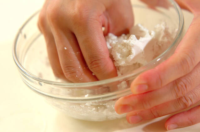 ボウルに白玉粉を入れ、水を少しずつ加えながら耳たぶ位の柔らかさに練る。