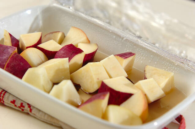耐熱皿に水気をきったリンゴ、サツマイモ、レーズンを並べ入れ、ラム酒、ハチミツをかけ、ラップをして電子レンジで2分加熱する。