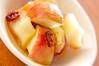 リンゴは皮ごときれいに水洗いし、縦8等分に切り、芯を取ってひとくち大に切り、サツマイモと一緒に塩水に放つ。