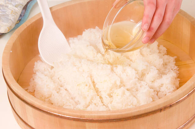 飯台(すし桶)に作りおき甘酢を大さじ2入れて手で全体になじませ、炊きあがったご飯をあける。残りの作りおき甘酢をかけ、1分位そのままおいて、ご飯にしみ込ませる。しゃもじで切るように混ぜ、手早く冷ましておく。(部屋が乾燥して入る場合は、布巾を堅く絞りかけておきましょう。)