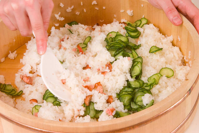ほぐしたタラコを全体に混ぜ合わせ、キュウリも混ぜ合わせる。