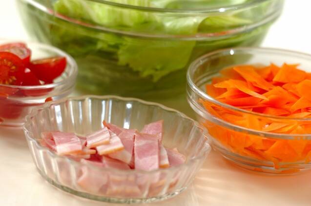 ニンジンは皮をむき、ささがきにする。ベーコンは幅1cmに切る。レタスは食べやすい大きさにちぎる。プチトマトはヘタを取り、半分に切る。