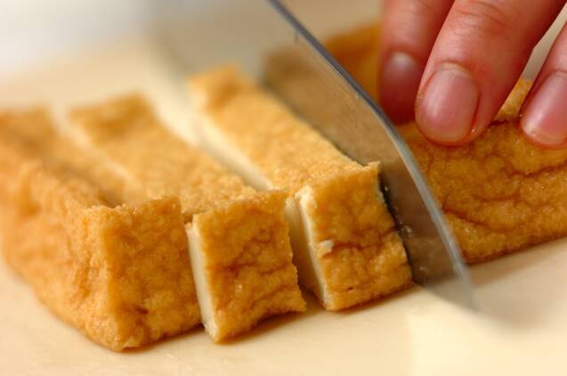 厚揚げは横に包丁を入れ、厚さを半分に切り、端から幅1cmに切る。モヤシはできればヒゲ根を取って水に放ち、ザルに上げて水気をきる。ニラは長さ3cmに切る。