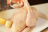 腹側を上にして置き、尾の下位から糸を交差させて足にかけしっかりくくり形を整える。