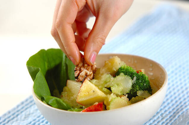 器にサラダ菜、(1)を盛り、クルミを散らしてプチトマトを添え、ミントの葉を飾る。