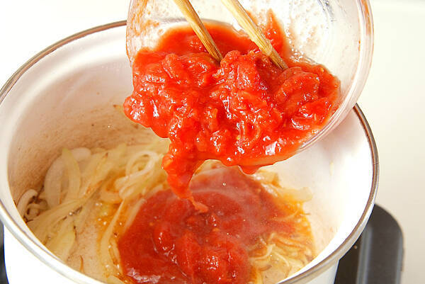 水煮トマトを加え、顆粒ブイヨンも加えて煮立てばシメジ、マッシュルームを加え弱めの中火にし、蓋をして3~4分煮てハンバーグを加え、更に1分煮込み、塩コショウで味を調える。(ときどき混ぜながら煮込んで下さい)