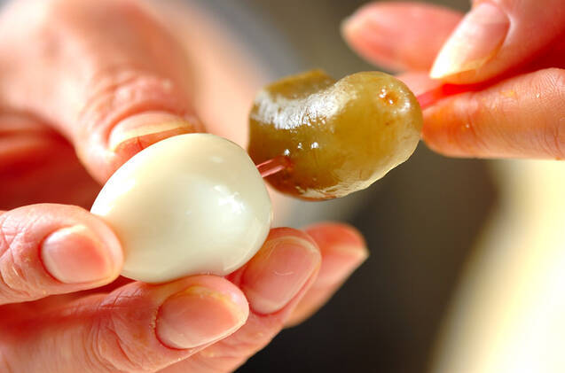 ピックにウズラの卵とピクルスを各々1個ずつ刺す。