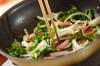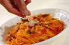 準備した<ゆで湯>が沸騰したら、スパゲティーを加える。常にフツフツ煮たった状態で、袋の表示時間より1分短めにゆでる。