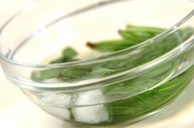 塩を入れた熱湯でホウレン草をゆで、冷水に取って色止めをする。水気をきり、3cm幅に切る。