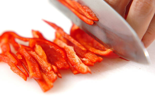 赤ピーマンは縦半分に切って種とワタを取り、細切りにする。