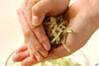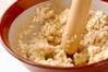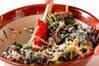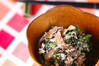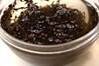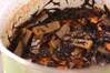 鍋に芽ヒジキ、干しシイタケ、板コンニャク、<合わせだし>を入れて強火にかける。煮汁がほとんどなくなるまで時々混ぜながら煮て、粗熱が取れたら冷やしておく。