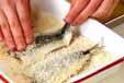 イワシに薄く小麦粉をつけ、溶き卵をくぐらせ、パン粉をつける。