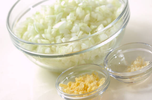 玉ネギ、ニンニク、ショウガは皮をむき、みじん切りにする。