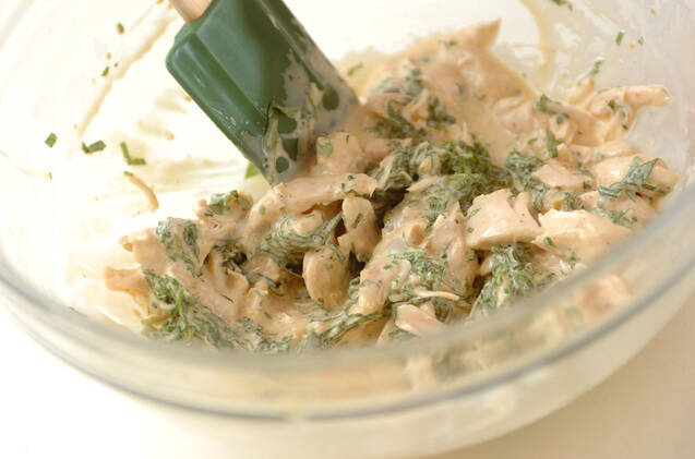 ボウルで大葉、鶏ささ身、<調味料>の材料を混ぜ合わせる。