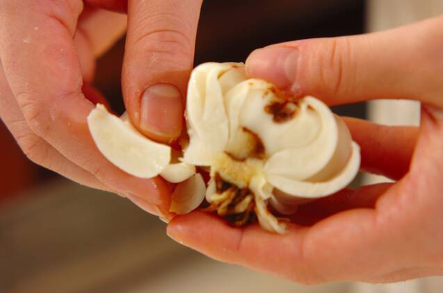 お米は水洗いし、30分吸水してザルに上げる。ユリネは1片ずつに分けて、水洗いする。マイタケは小房に分ける。昆布は、汚れをサッと拭き取る。