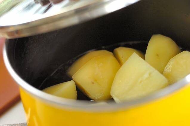 鍋に水気をきったジャガイモを入れて水を注ぎ、塩を加えて中火にかける。煮たったら弱火にし、鍋に蓋をして蒸し煮にする。