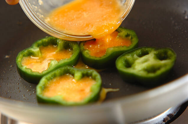フライパンにサラダ油を熱し、ピーマンを置いて溶き卵を流し入れる。両面焼いて、ケチャップをかける。