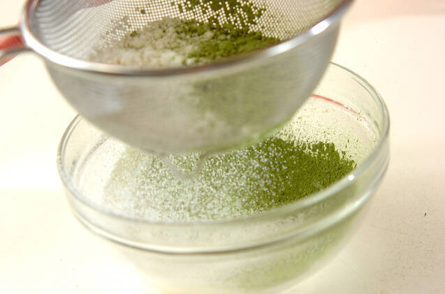 <抹茶スポンジ>の薄力粉と抹茶は合わせて振るい、バターと牛乳は合わせて人肌程度に温めておく。