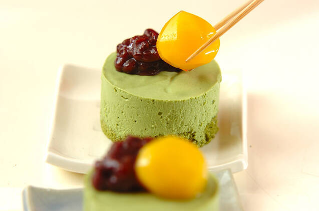 固まったら型から外し、栗(甘露煮)、ゆで小豆、セルフィーユを飾って仕上げる。