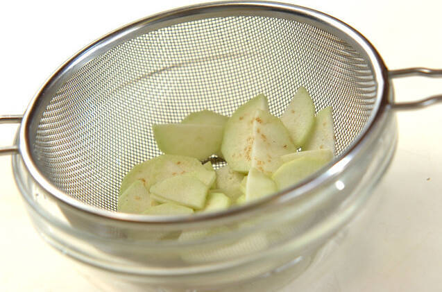 ナスはヘタを切り落として皮をむき、縦半分に切る。さらに薄い半月切りにして水に放ち、ザルに上げる。
