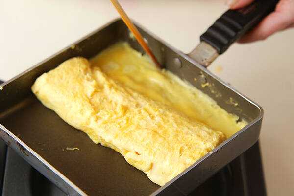空いた所にサラダ油を引き、残りの卵液の1/4~1/3量を流し入れる。向こう側に寄せた卵の下に菜ばしを入れ、卵を少し持ち上げて下にも流し入れ、全体に広げる。半熟になれば向う側から、手前に巻く。空いた所にサラダ油を薄く敷き、手前に来ている卵を向こう側に寄せる。卵液がなくなるまで同様にくり返す。