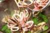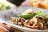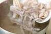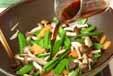 中華鍋にサラダ油、ショウガを加えて弱火で熱し、香りが立ってくれば強火でシメジ、ニンジン、キクラゲを炒め、キヌサヤを加えて炒めあわせる。