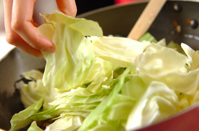 合いびき肉の色が変わったらカレー粉、小麦粉を加えて炒め合わせ、キャベツを加える。