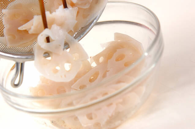 熱湯に<ゆでる用>の酢、塩を加え、水気をきったレンコンを加え、レンコンが透き通るまでゆでる。ザルに上げて水気をきり、熱いうちに<下味>の材料を加えて混ぜ合わせ、冷ます。