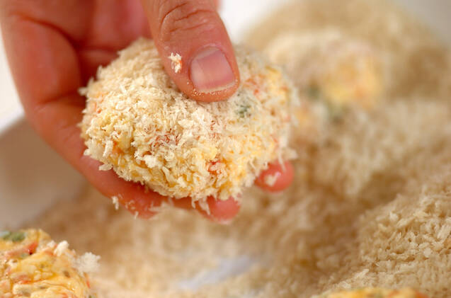 6等分の小判型にまとめ、<衣>の小麦粉、溶き卵、パン粉を順につける。