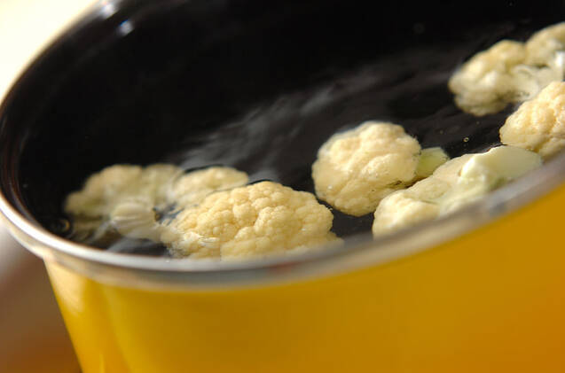 カリフラワーは小房に分け、分量外の酢少々を入れた熱湯で、お好みのかたさになるまでゆで、ザルに上げる。