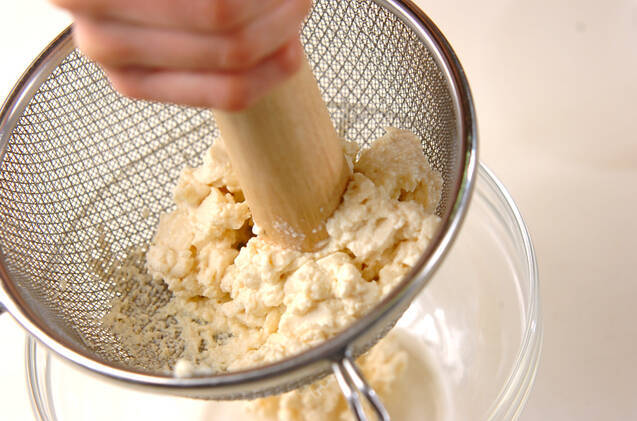 絹ごし豆腐はキッチンペーパーで包み、重しをかけて20分以上しっかり水気を切り、網を通しておく。
