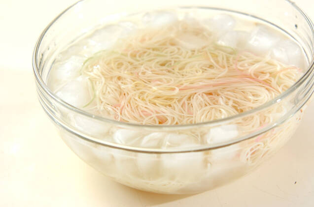 素麺は袋の指示通りにゆで、流水で粗熱を取って氷水に放ち、しっかり水気をきる。