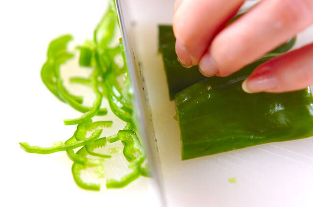 ピーマンは縦半分に切ってヘタと種を取り、横細切りにする。ニンジンは皮をむき、縦せん切りにする。